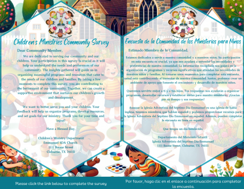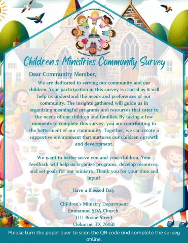 At Emmanuel SDA Church, we cherish our community and its children. We’re dedicated to nurturing the spiritual and personal growth of our children, and we invite you to participate in our Children's Ministries Community Survey. Your valuable feedback will help us understand the needs and preferences of our families, enabling us to create meaningful programs and resources.