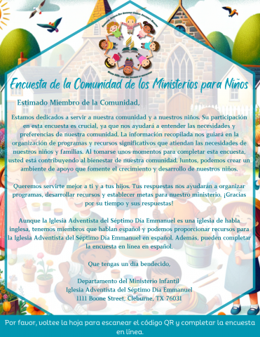 En la Iglesia Emmanuel SDA, valoramos nuestra comunidad y a sus niños. Nos dedicamos a fomentar el crecimiento espiritual y personal de nuestros hijos, y los invitamos a participar en nuestra Encuesta de Ministerios Infantiles. Sus valiosos comentarios nos ayudarán a comprender las necesidades y preferencias de nuestras familias, permitiéndonos crear programas y recursos significativos.